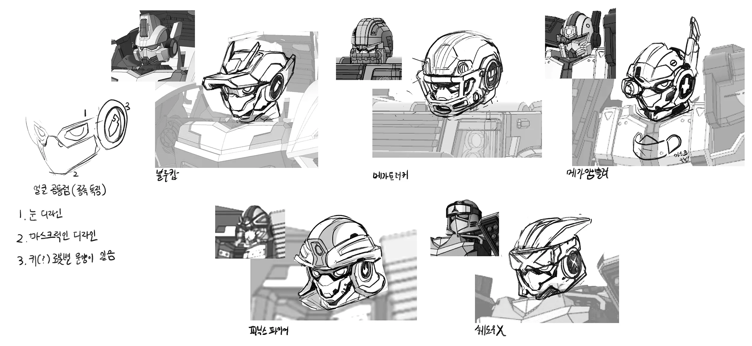↩ ↩2헤드만은 재디자인이 허용 된 메탈카드봇들의 머리들. 기존 헤드도 왕도적인 변신로봇의 멋이 있지만, 조금이라도 시리즈만의 공통된 특징을 만들 필요가 있다고 생각했어요. 그 결과 눈동자(취향 반영)와 입없는 마스크가 그것. 시간은 많지 않았기에 왠만하면 한 방의 스케치로 정해졌습니다.